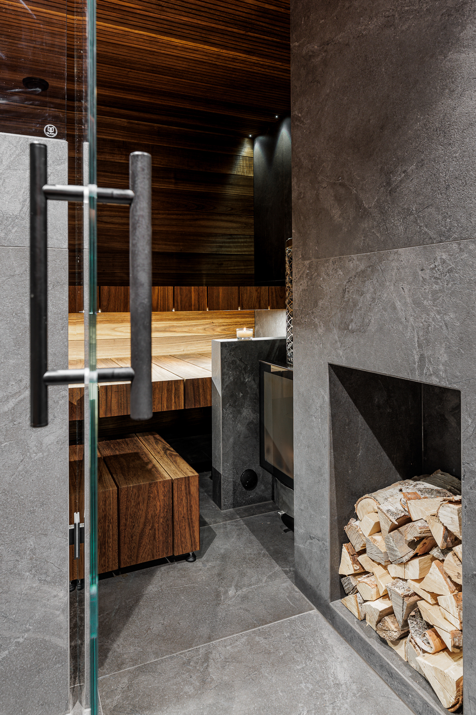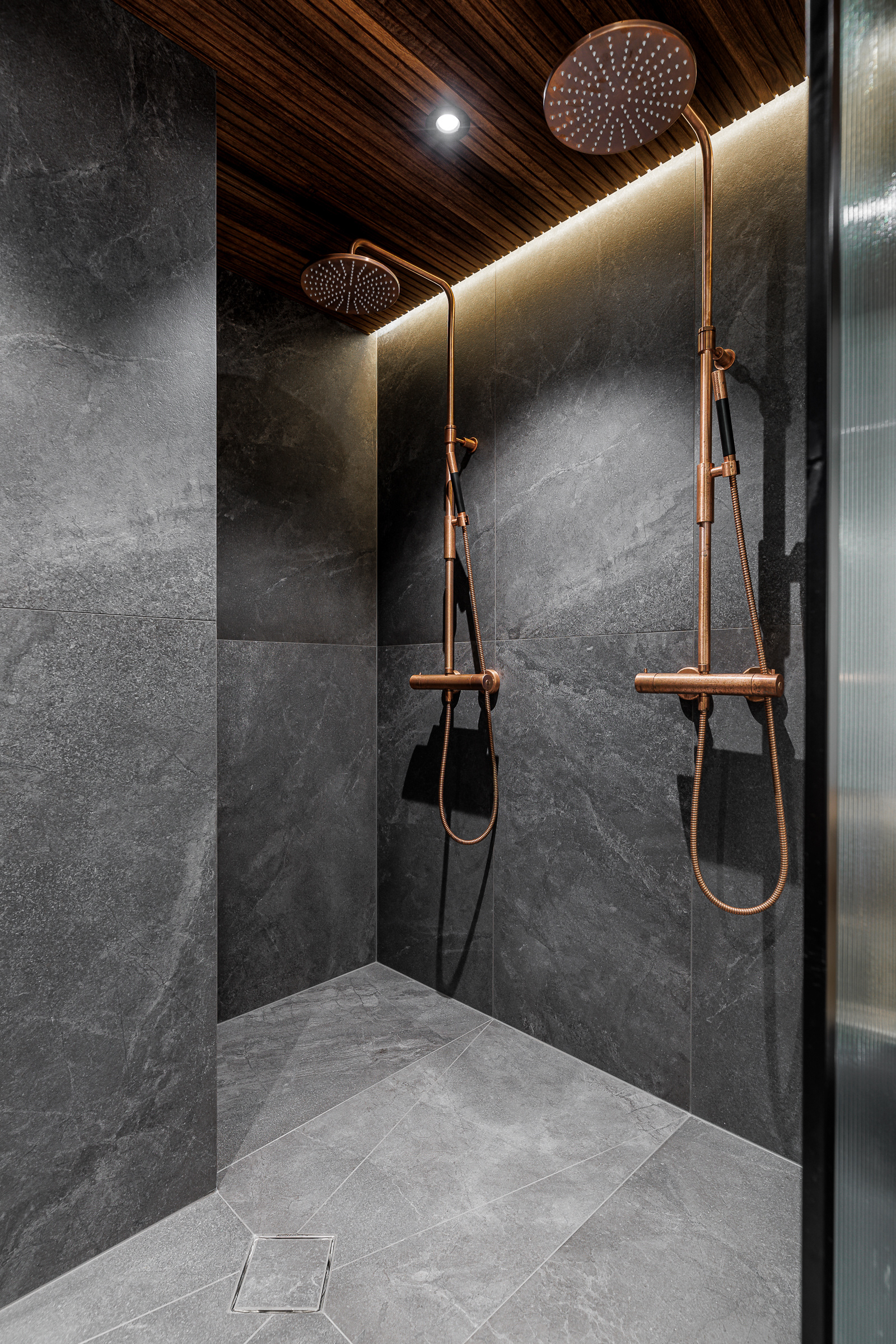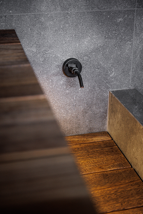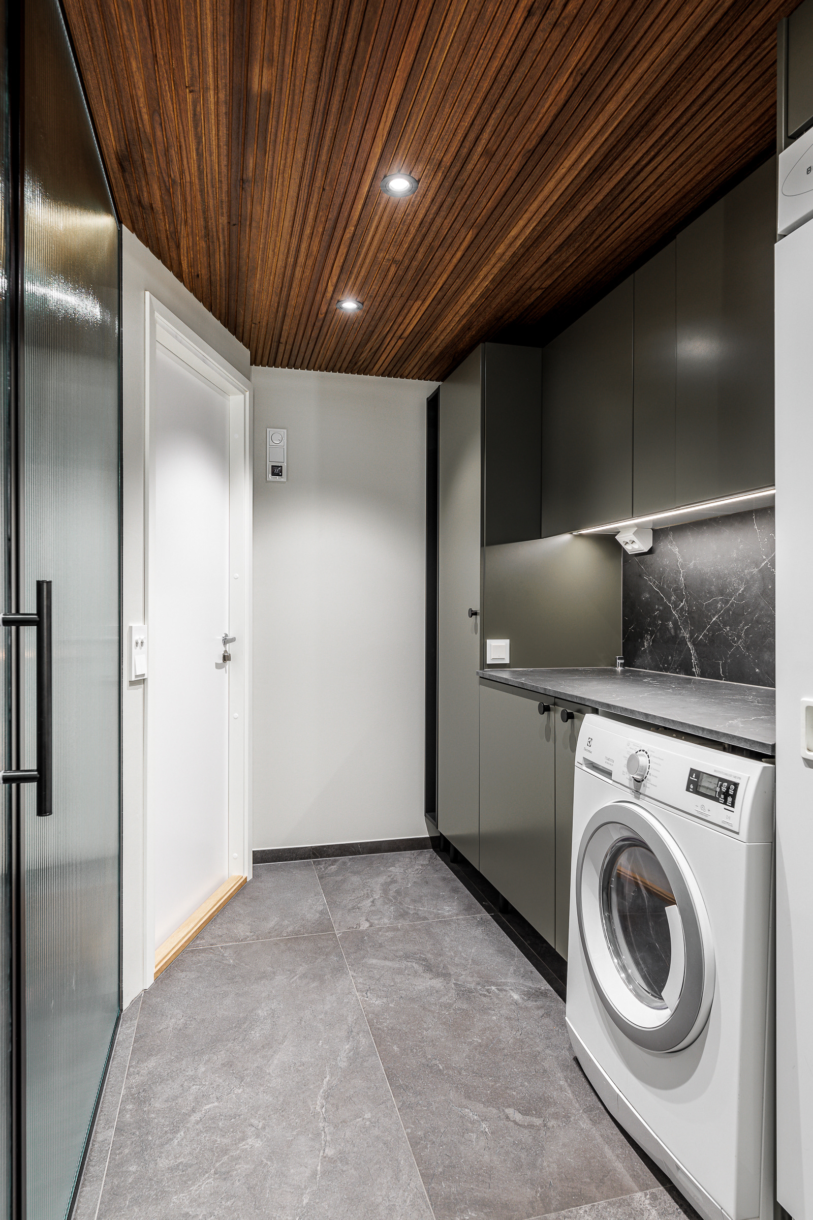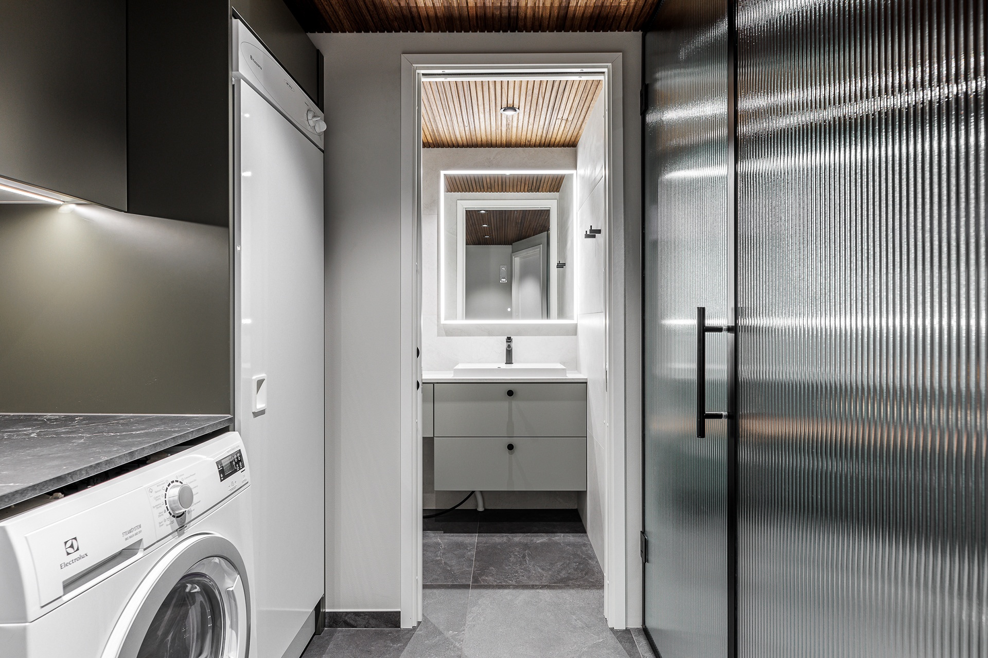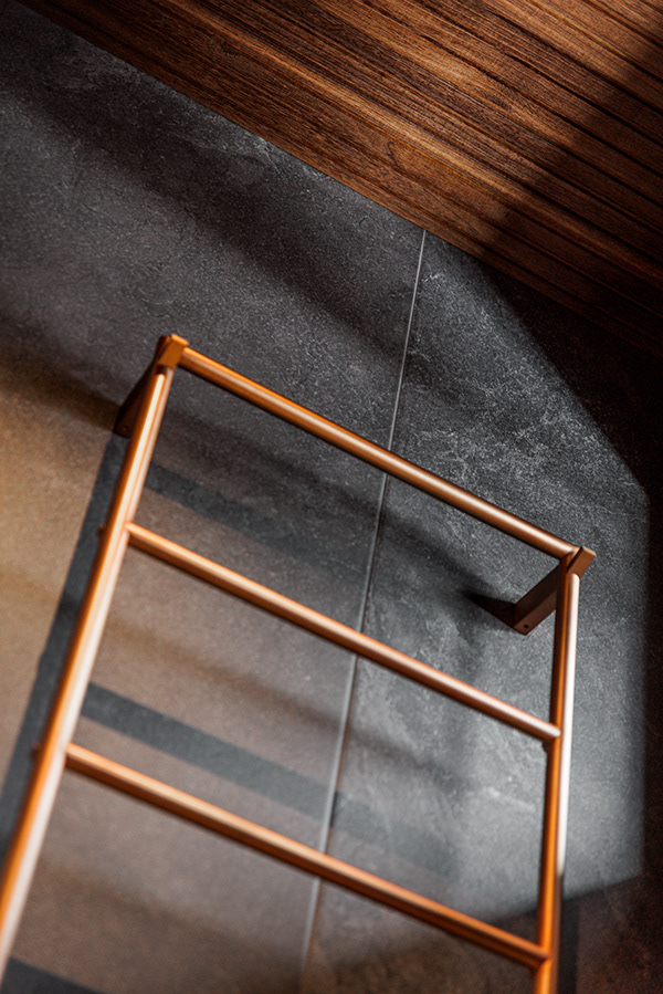 Tässä kohteessa suunnittelun tärkeys korostui entisestään, kun rajallisen pieneen tilaan täytyi mahduttaa kylpyhuone, sauna, erillinen wc sekä kodinhoitohuone. Keisaripuuta käytettiin saunaan, kattoon ja kylpyhuoneen mittatilauspenkkiin. Kupariset yksityiskohdat tuovat tilaan kontrastia ja ilmettä.