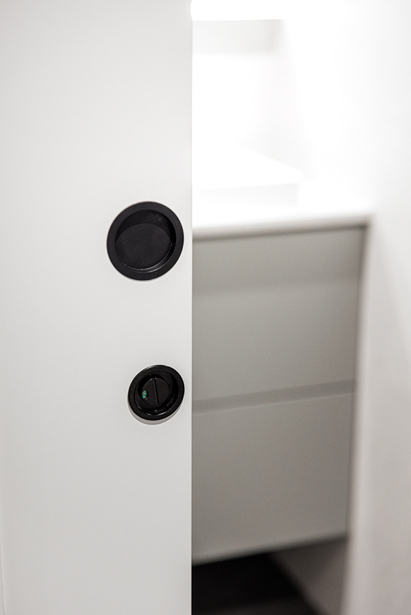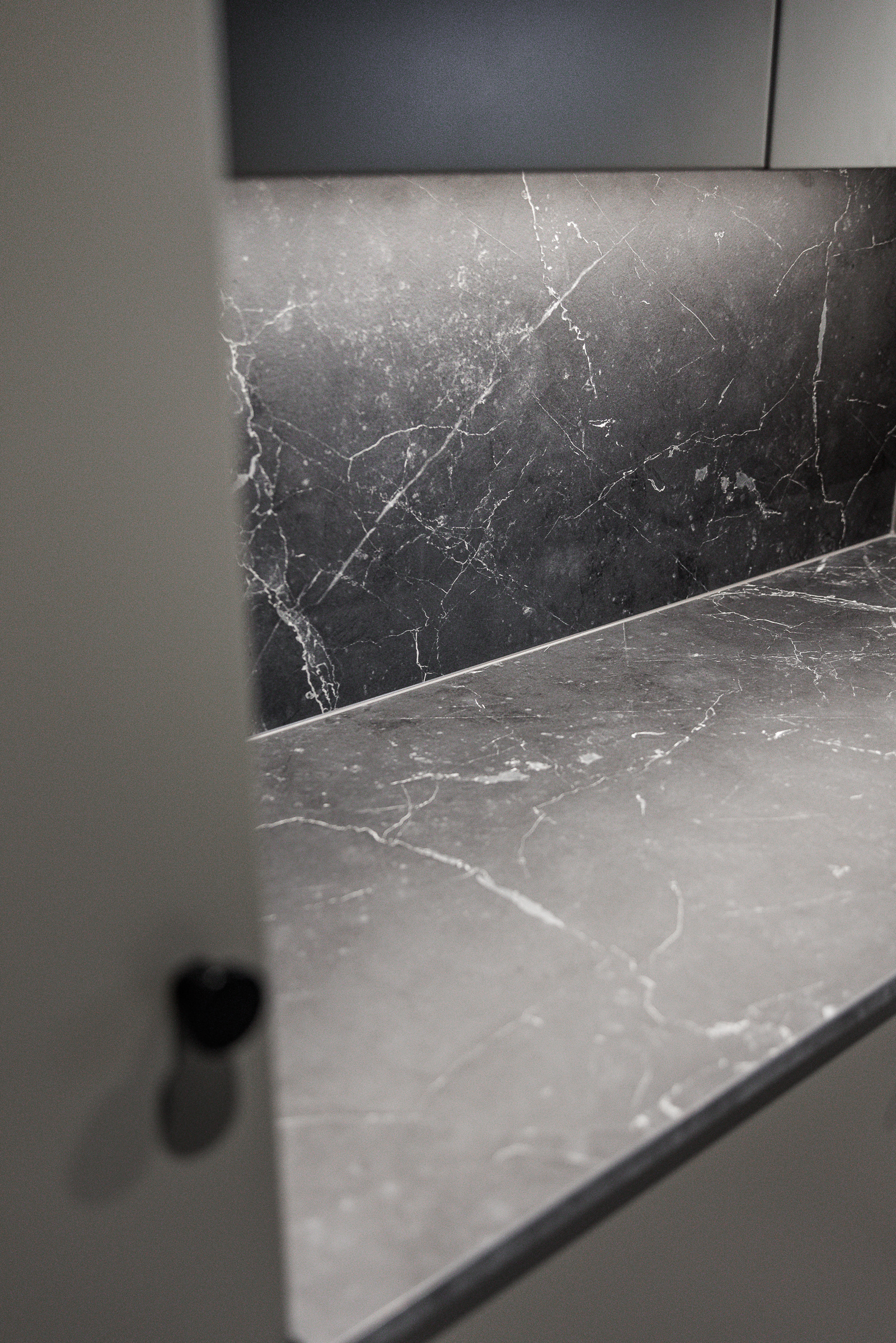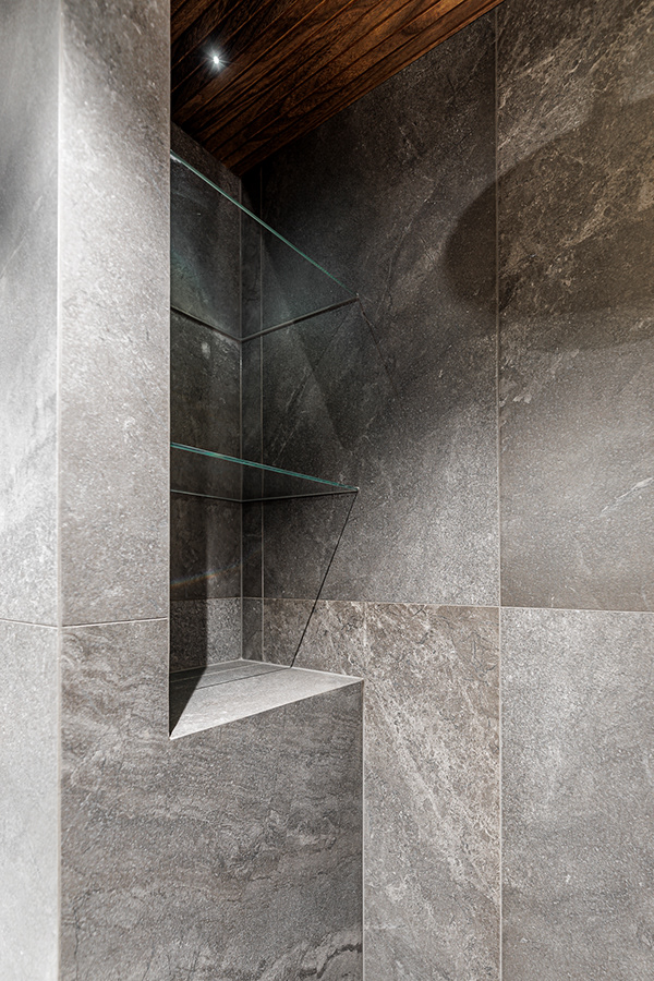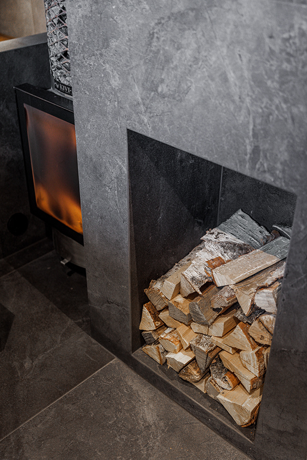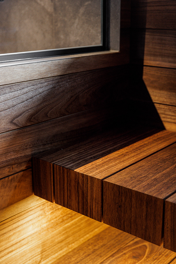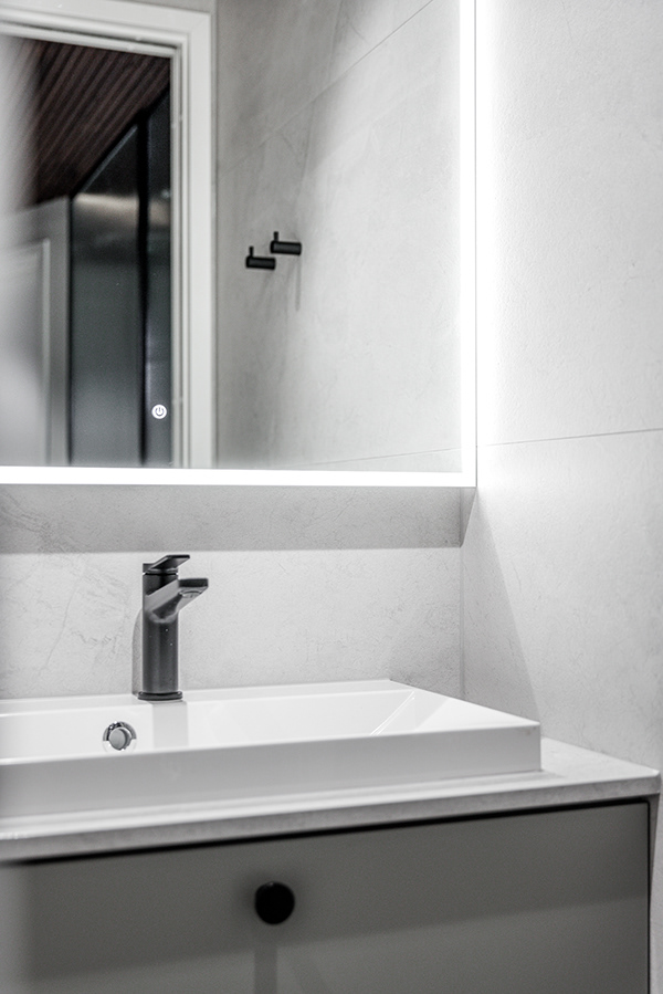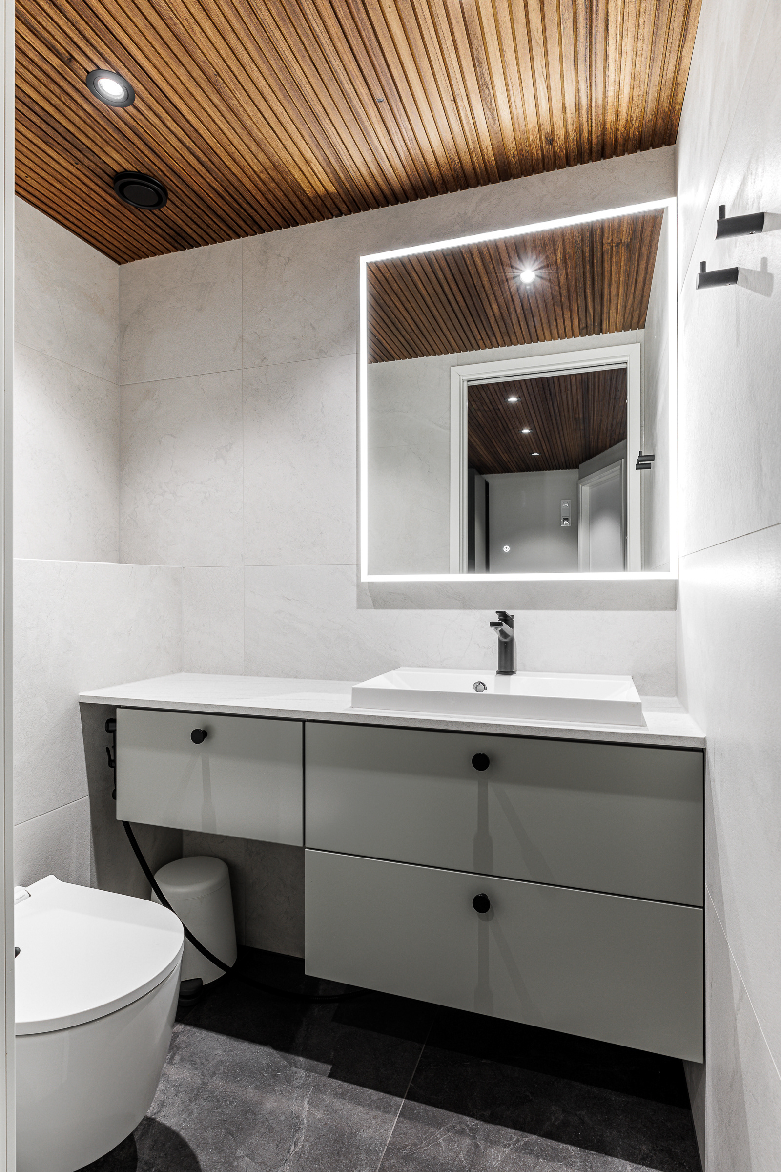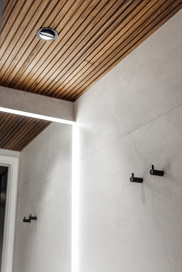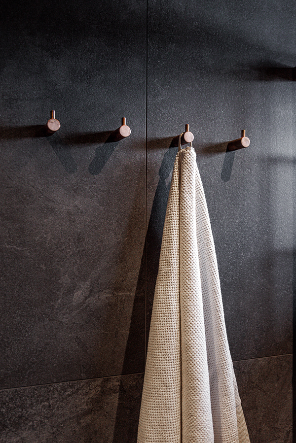 Tässä kohteessa suunnittelun tärkeys korostui entisestään, kun rajallisen pieneen tilaan täytyi mahduttaa kylpyhuone, sauna, erillinen wc sekä kodinhoitohuone. Keisaripuuta käytettiin saunaan, kattoon ja kylpyhuoneen mittatilauspenkkiin. Kupariset yksityiskohdat tuovat tilaan kontrastia ja ilmettä.