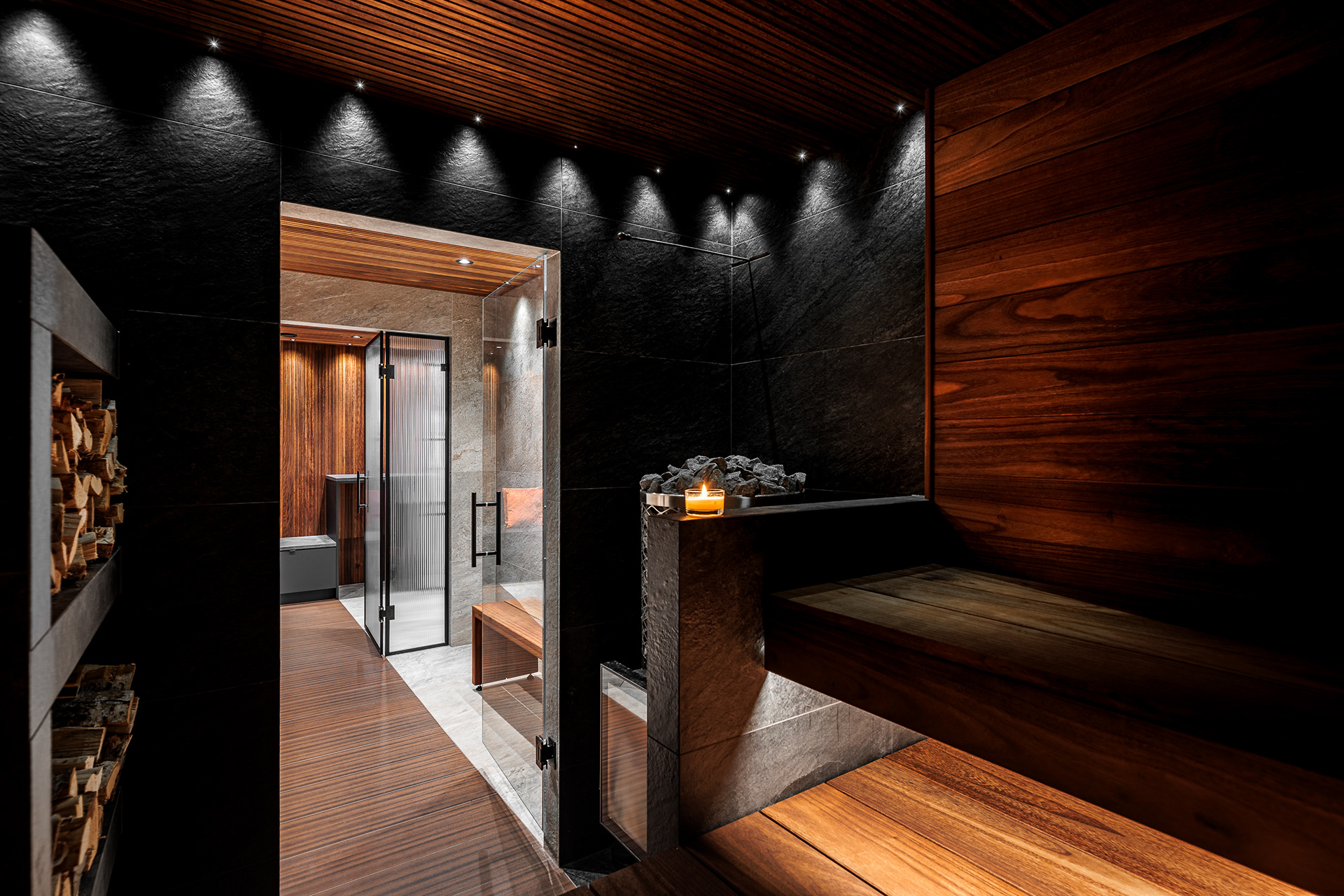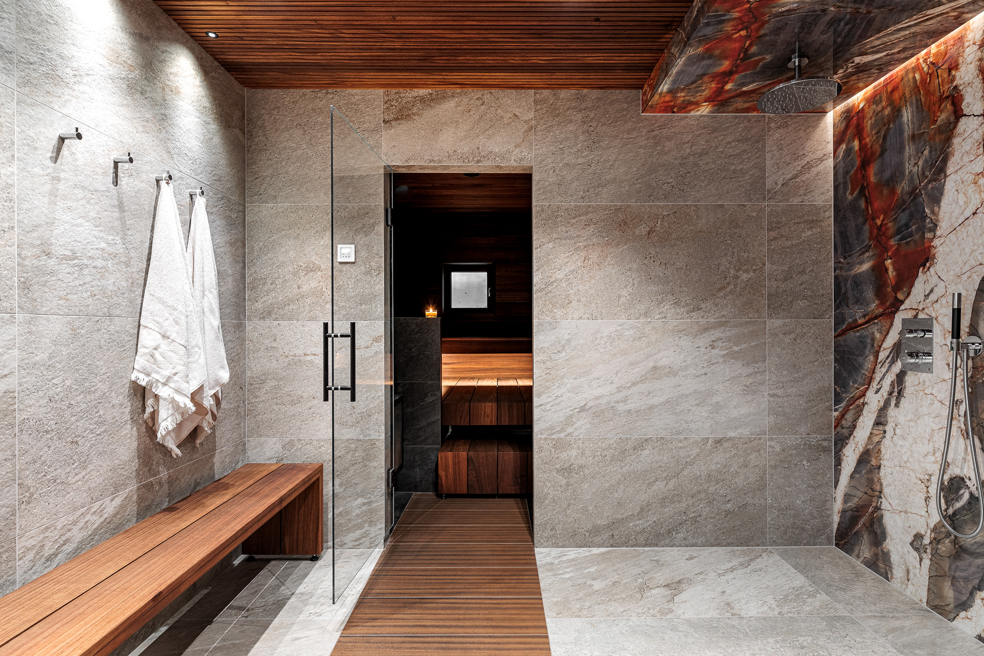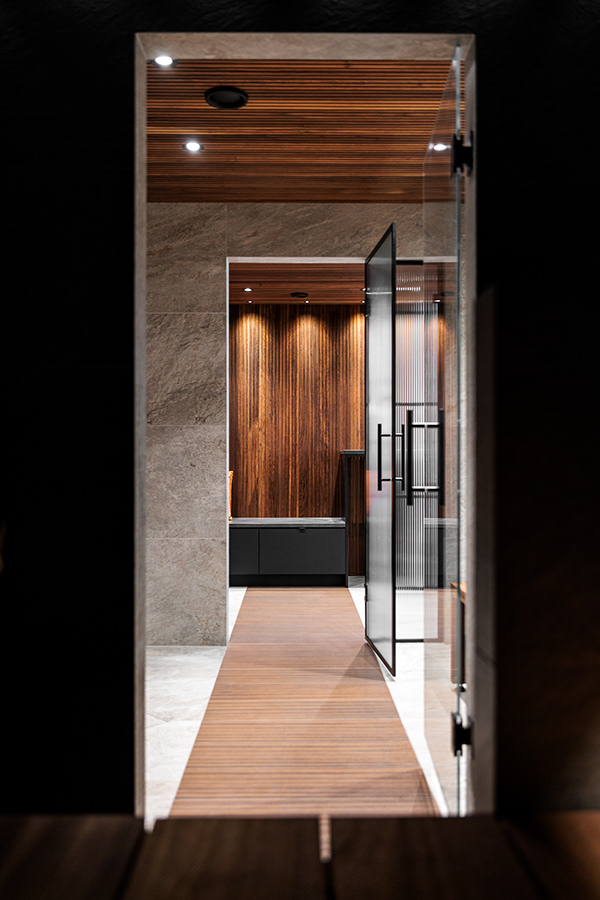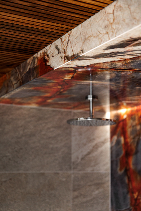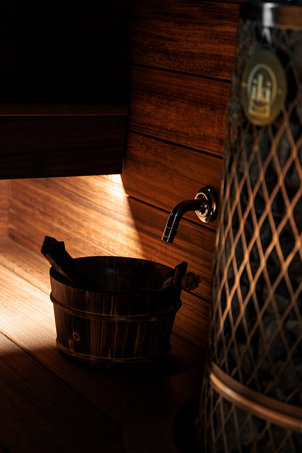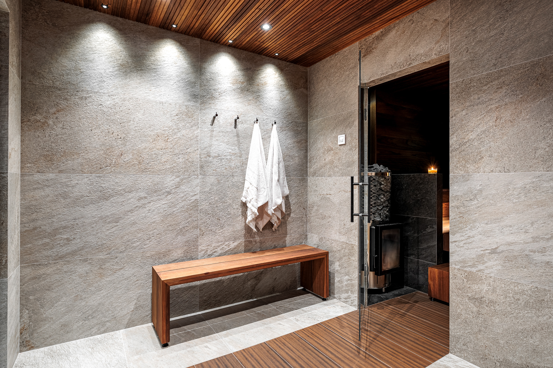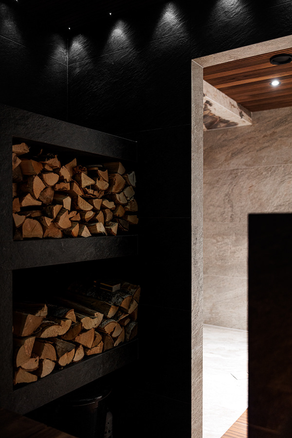 Kohteessa remontointiin käytännössä koko alakerta. Kylpyhuoneen helmi on näyttävästä jättilaatasta tehty suihkuseinä. Suihkut integroitu piiloon katto- ja seinärakenteeseen. Saunassa sekä puu- että sähkökiuas. Pukuhuoneessa kalusteet tehty mittatilauksena ja ovi tekniseen tilaan "naamioitu". Lisäksi wc-tilan pinnat päivitettiin, takka vaihdettiin uuteen ja tv:lle tehtiin upea tv-seinä ja mittatilauskaluste Keisaripuusta.