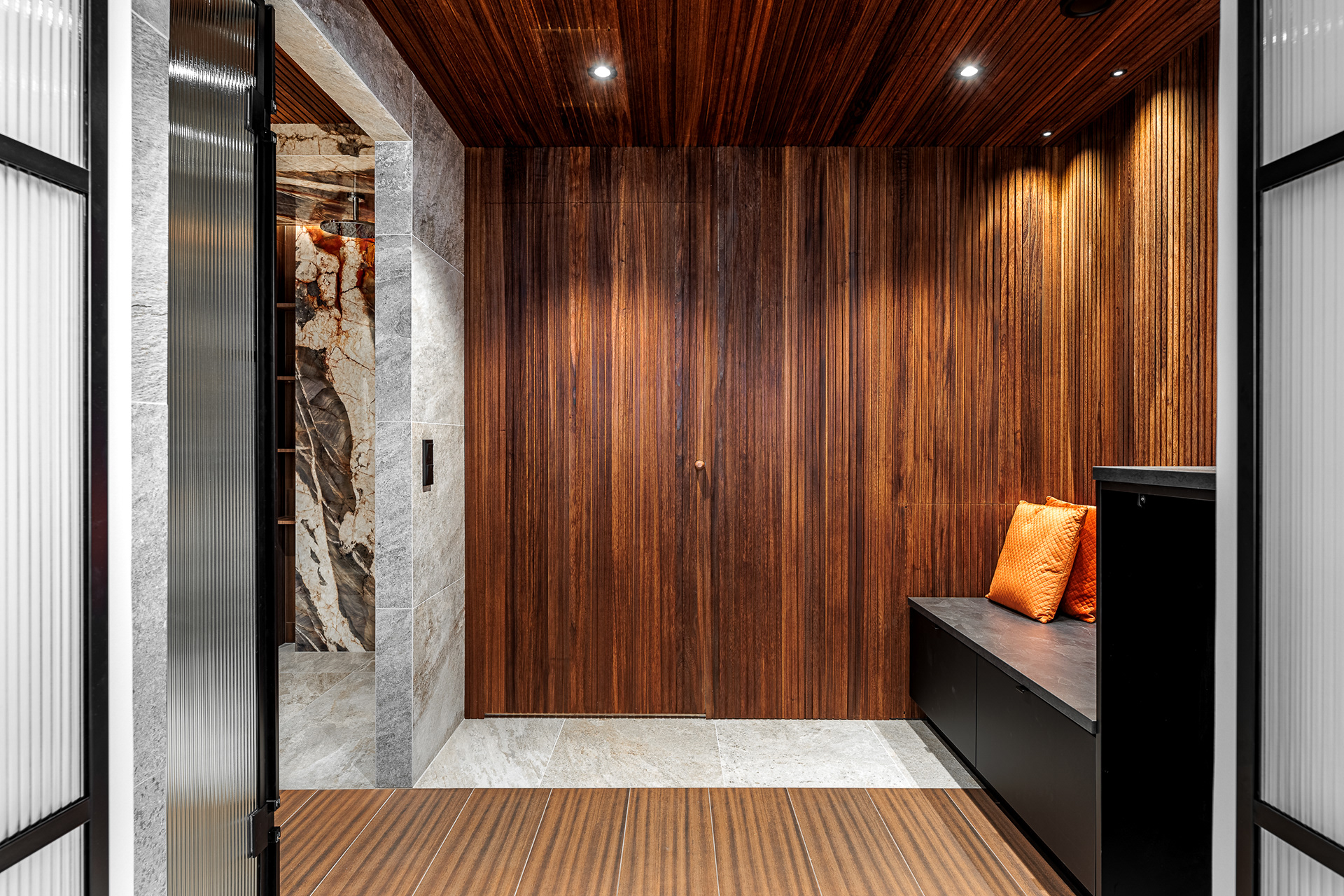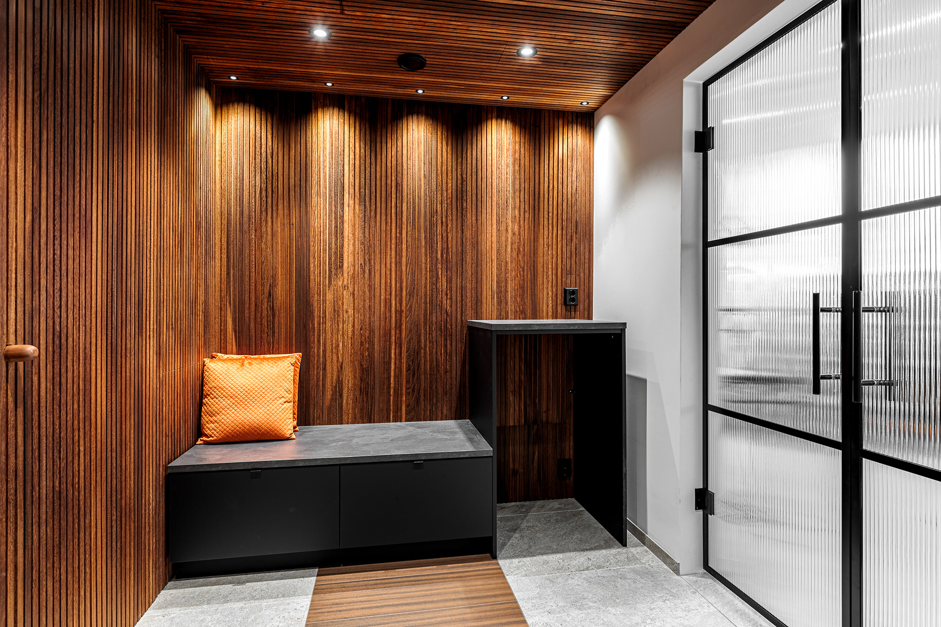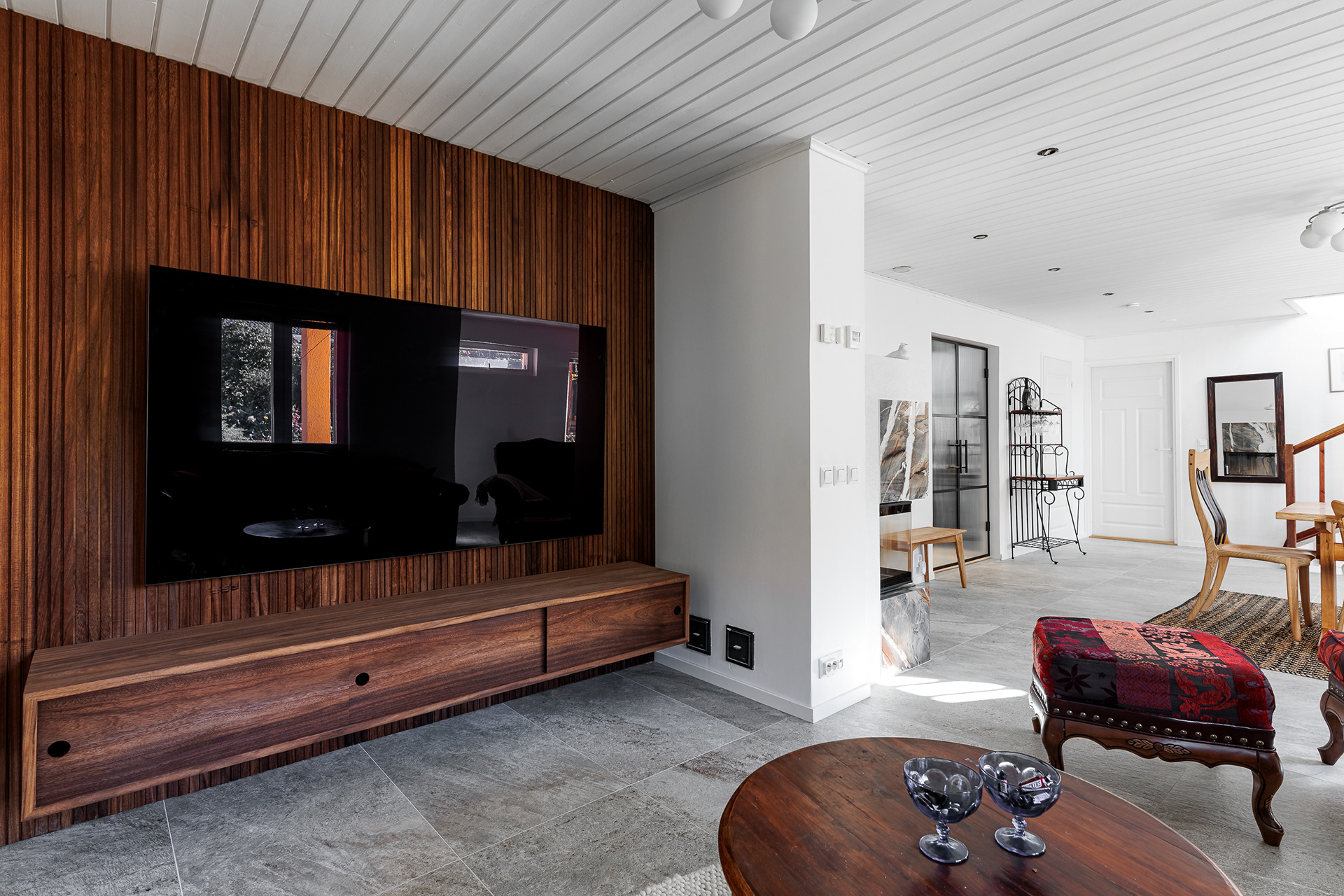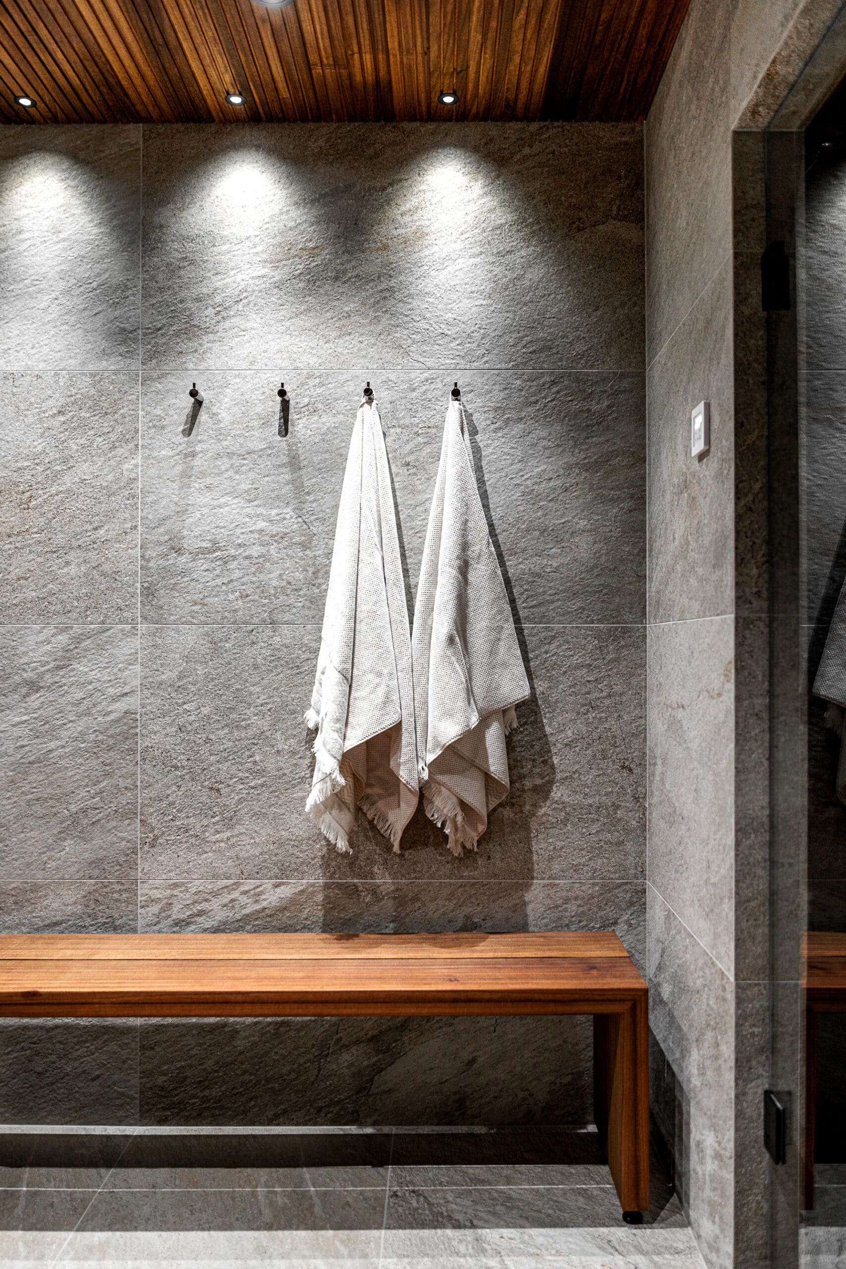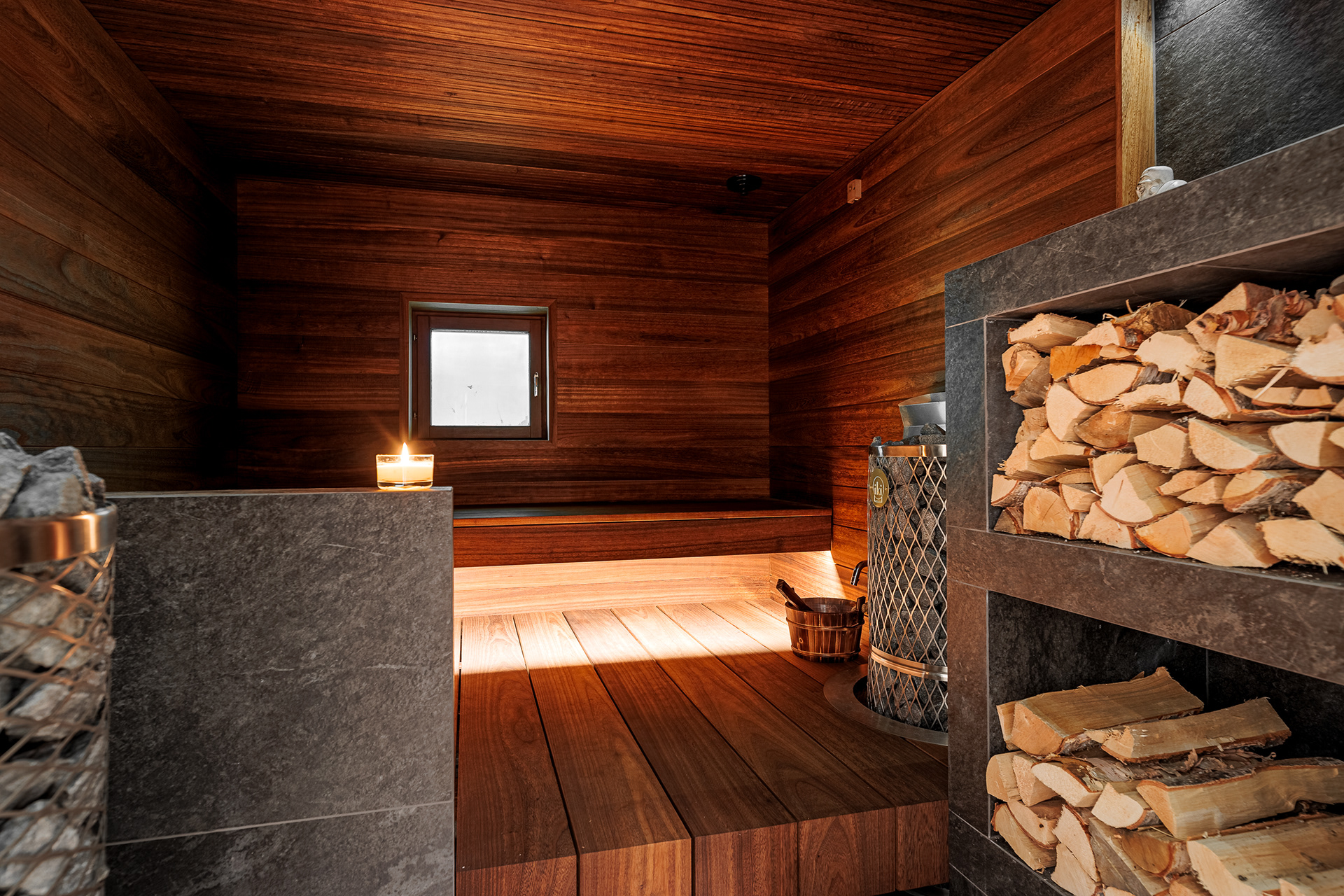 Kohteessa remontointiin käytännössä koko alakerta. Kylpyhuoneen helmi on näyttävästä jättilaatasta tehty suihkuseinä. Suihkut integroitu piiloon katto- ja seinärakenteeseen. Saunassa sekä puu- että sähkökiuas. Pukuhuoneessa kalusteet tehty mittatilauksena ja ovi tekniseen tilaan "naamioitu". Lisäksi wc-tilan pinnat päivitettiin, takka vaihdettiin uuteen ja tv:lle tehtiin upea tv-seinä ja mittatilauskaluste Keisaripuusta.
