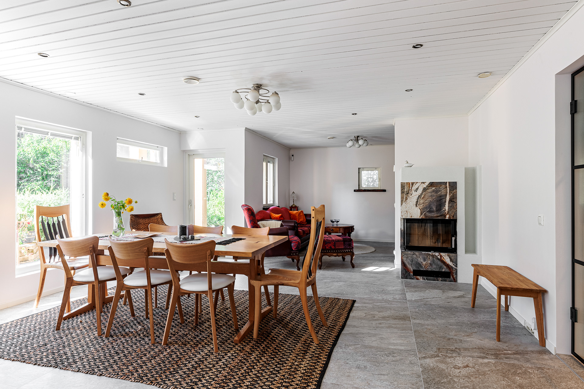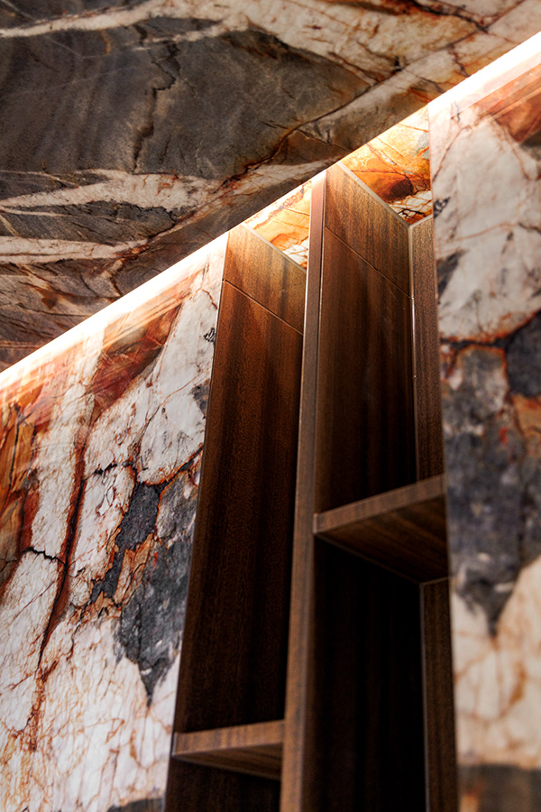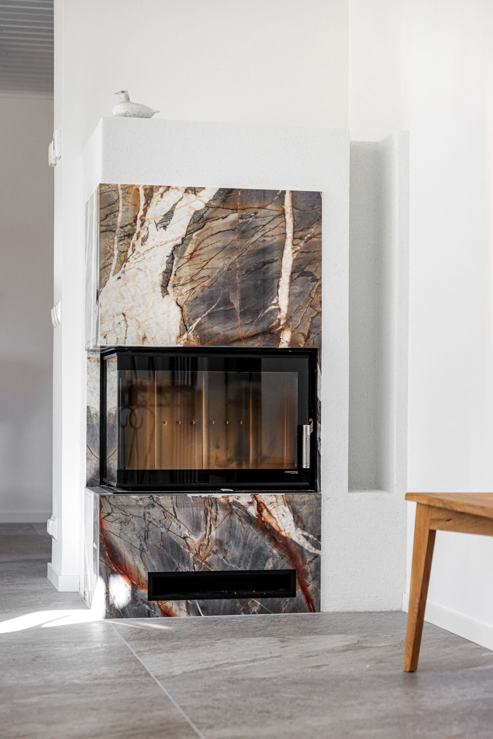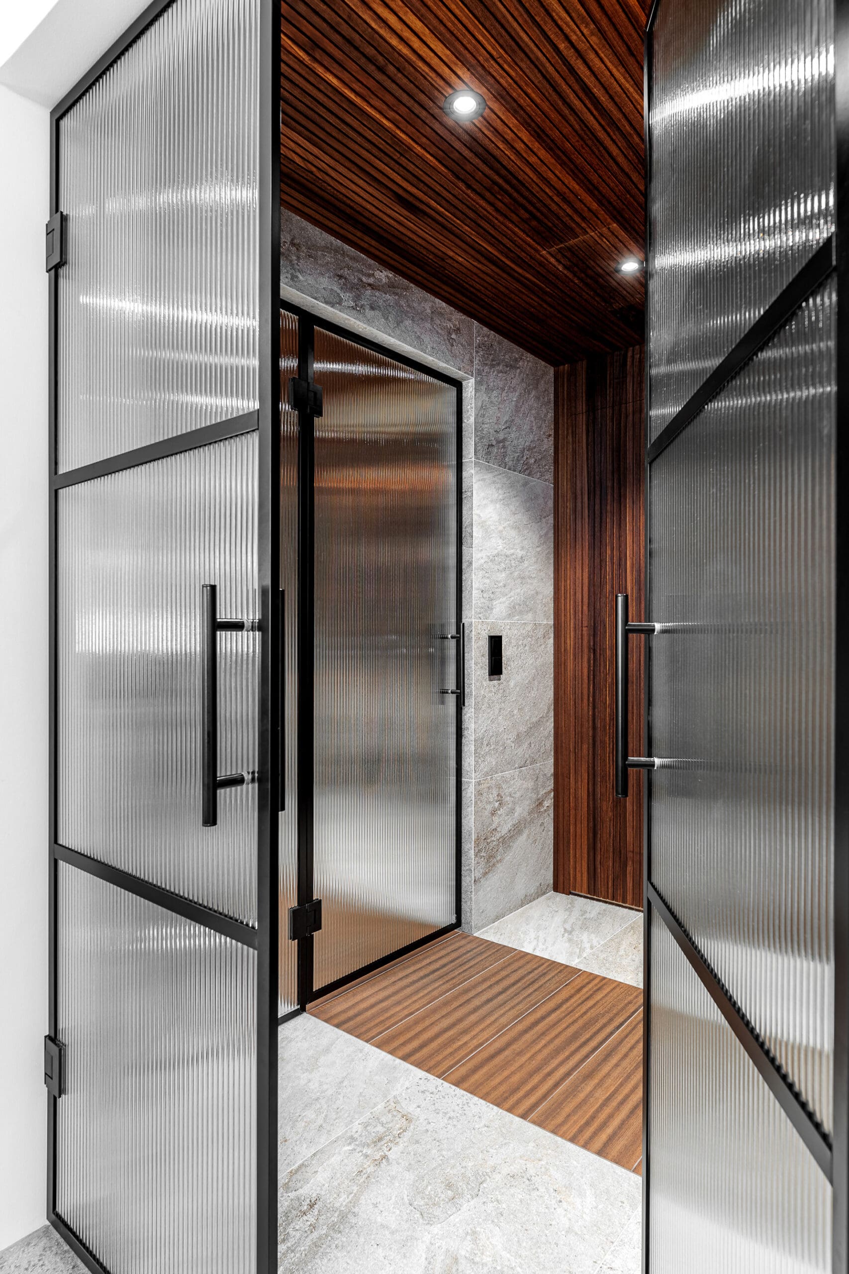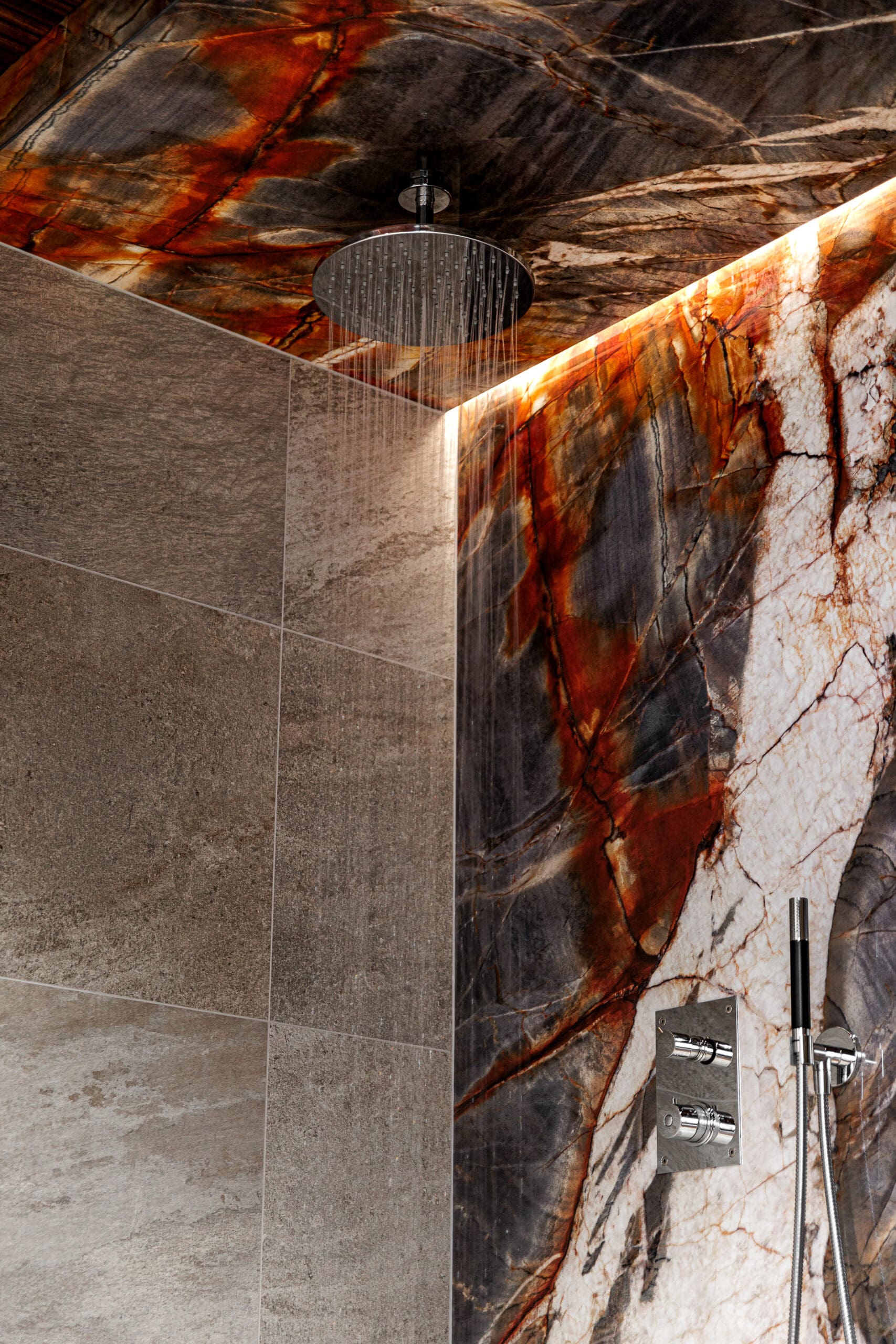 Kohteessa remontointiin käytännössä koko alakerta. Kylpyhuoneen helmi on näyttävästä jättilaatasta tehty suihkuseinä. Suihkut integroitu piiloon katto- ja seinärakenteeseen. Saunassa sekä puu- että sähkökiuas. Pukuhuoneessa kalusteet tehty mittatilauksena ja ovi tekniseen tilaan "naamioitu". Lisäksi wc-tilan pinnat päivitettiin, takka vaihdettiin uuteen ja tv:lle tehtiin upea tv-seinä ja mittatilauskaluste Keisaripuusta.